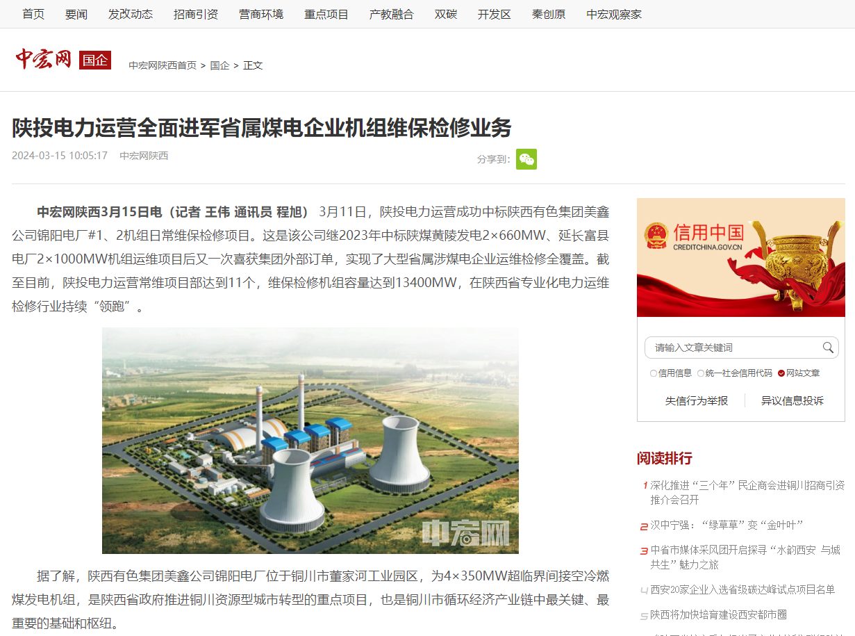 3月11日,公司中标陕西有色集团美鑫公司����� �������Ƴ����������� �������Ƴ������������ �������Ƴ����������� �������Ƴ�������锦阳电厂#1、����� �������� �������Ƴ������������ �������Ƴ������������ �������Ƴ������������ �������Ƴ�����������Ƴ�������2机����� �������Ƴ������������ �������Ƴ������������ �������Ƴ������������ �������Ƴ�������组日常维保检修项目。这是公司继2����� �������Ƴ������������ �������Ƴ����������� �������Ƴ������������ �������Ƴ�������023年中标陕煤黄陵发电2×660MW、延长富����� �������Ƴ������������ �������Ƴ����������� �������Ƴ������������ �������Ƴ�������县电厂2×1000MW机组运维项目后又一次喜获集����� �������Ƴ������������ �������Ƴ������������ �������Ƴ������������ �������Ƴ�������团外部订单,实现了大型省属涉煤电企业����� �������Ƴ������������ �������Ƴ����������� �������Ƴ������������ �������Ƴ�������运维检修全覆盖。目前公司常维项目部达到11����� �������Ƴ������������ �������Ƴ������������ �������Ƴ������������ �������Ƴ�������个,维保检修机组容量达到13400MW,在陕����� �������Ƴ������������ �������Ƴ������������ �������Ƴ������������ �������Ƴ�������西省专业化电力运维检修行业持续“领跑”。
